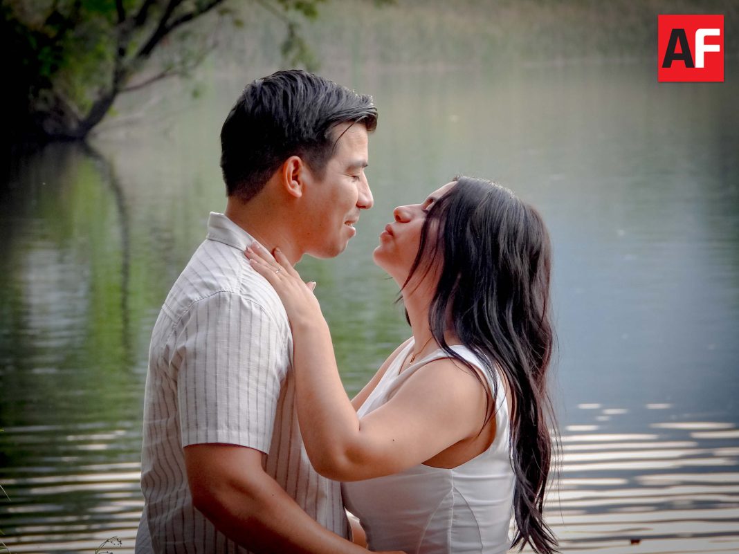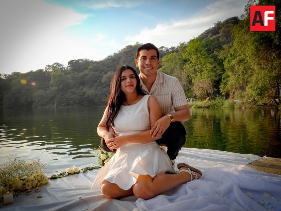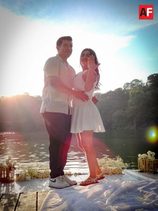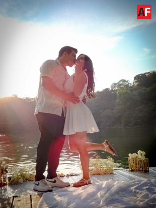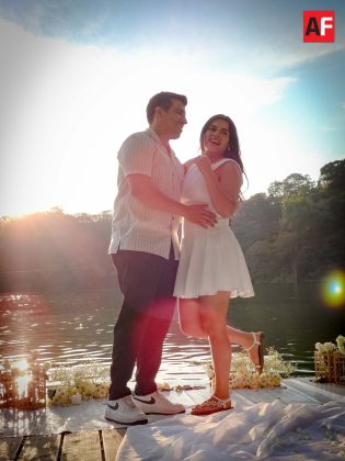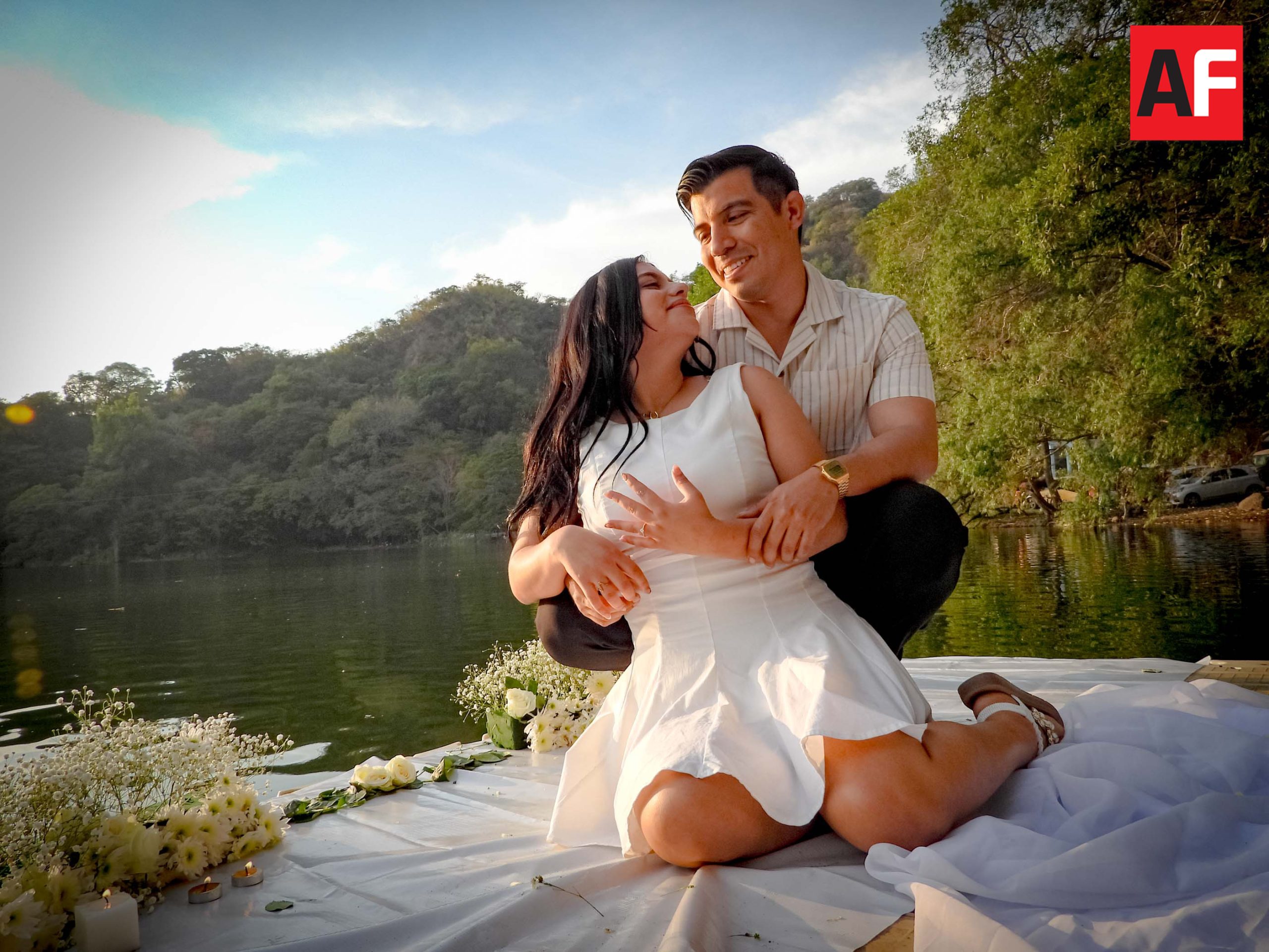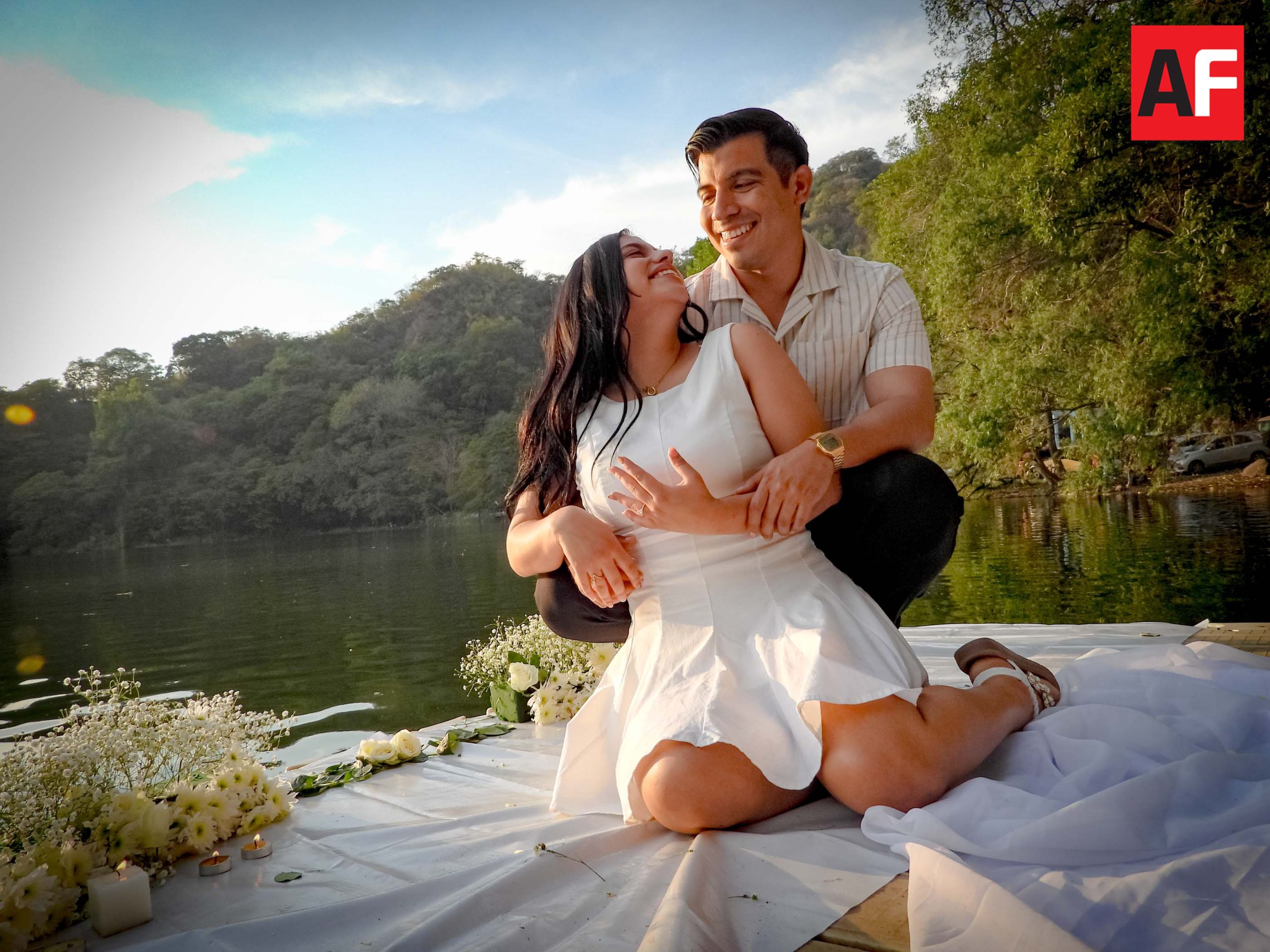 Con el lago como un espejo de tonos dorados, Kender decidió que no había mejor manera de comenzar el año que declarando su amor. El muelle de madera, habitualmente sencillo, fue transformado para la ocasión: lienzos de telas blancas que ondeaban suavemente con la brisa de la montaña y elegantes arreglos de rosas blancas crearon un pasillo de romance.